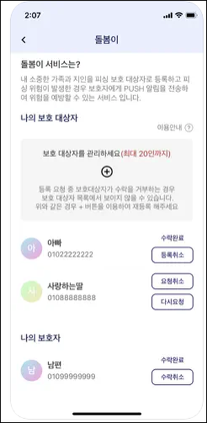 피싱아이즈는 제휴금융사와 다양한 유형의 피싱에 대해 공동으로 분석하고 대응함으로써, 이용자들에게 최적의 예방의 솔루션을 제공합니다. 피싱아이즈는 나의 가족 및 지인의 휴대폰에서