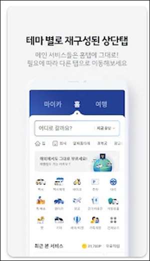 카카오 T의 혁신을 통해 모든 이동의 고민으로부터 벗어나 더 편하고, 즐겁고, 가치 있는 일상을 만들어갑니다. 테마 별로 재구성된 홈 상단탭에서 원하는 서비스를 찾아 이용해보세요. • 홈