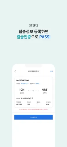 앱을 통한 등록 과정은 여권 스캔, 얼굴 등록, 탑승권 등록 순서로 구성됩니다. 여권은 카메라로 촬영하여 정보가 자동 인식되며, 얼굴 등록 단계에서는 안내에 따라 정면을 응시하면 됩니다. 전체 과정은 평균적으로 3분 내외로 완료됩니다.