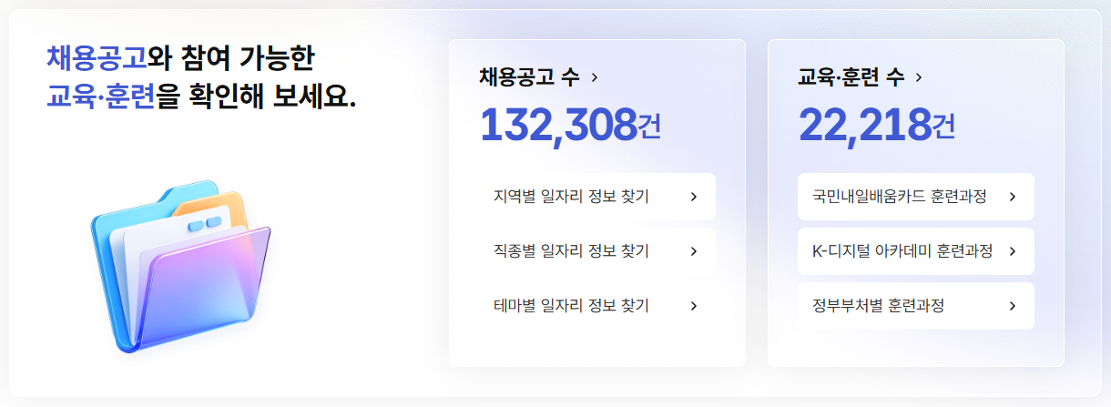 취업지원 관련 서비스는 고용부에서 운영하는 각종 지원 제도 정보를 제공합니다. 취업역량강화 프로그램, 자기소개서 작성 참고 자료, 채용 동향 자료 등이 포함되어 있으며, 국민취업지원제도와 일경험 지원 내용도 확인할 수 있습니다.